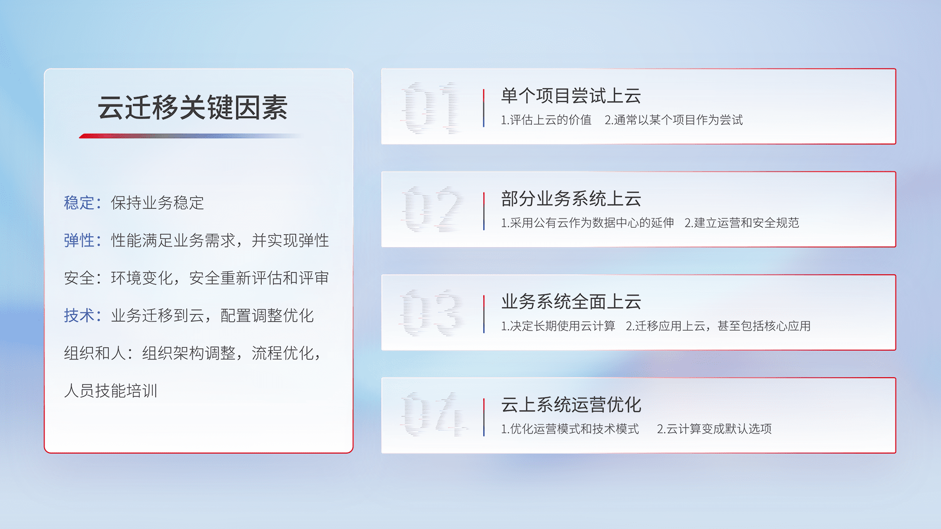 结合实际业务,,,,从规划设计、、云平台选型、、云原生改造、、数据迁移、、、、集成交付,,迁移全过程为客户识别最佳上云路径,,,,做好风险识别管理,,,,设计网络架构、、身份权限、、、、安全审计合规、、、、操作审计、、、日志审计、、、监控告警策略、、、、多站点容灾设计等,,,对云上基础设施进行整体规划,,提升IT治理水平,,,以满足弹性、、、、高可用、、高性能的需求。。。。