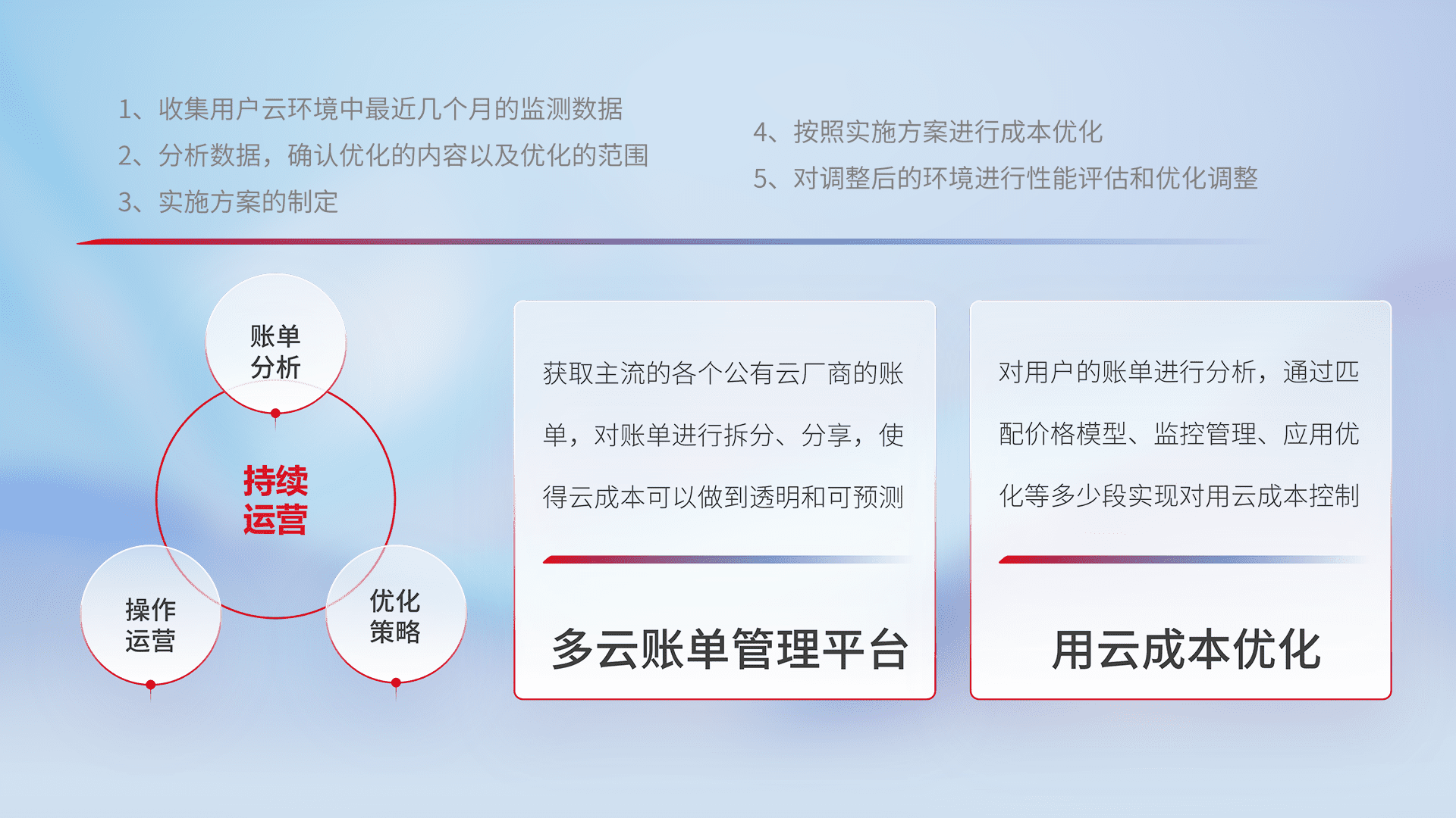 通过多云纳管,,,以统一的资源数据模型把客户的云资源进行抽象和封装,,,,进而实现对多云资源的统一操作,,保障云资源管理的可靠性、、、稳定性与可用性。。。量身定制化运维内容,,配置、、、、开发运维、、、补丁管理、、、、备份、、、、监控、、、、认证和访问管理、、审计和日常巡检等,,保障在用云过程中的可靠度,,,稳定度以及高可用率。。